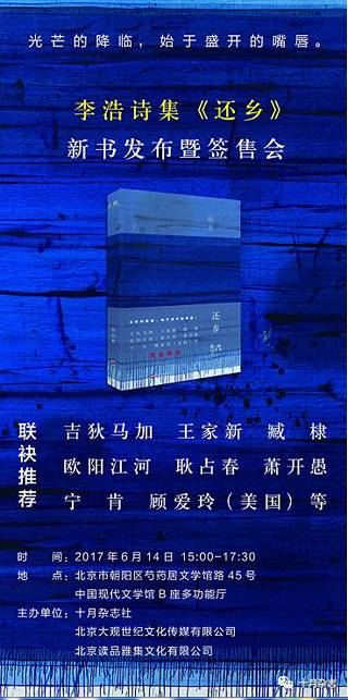 李浩诗集《还乡》发布暨签售会即将在京举办