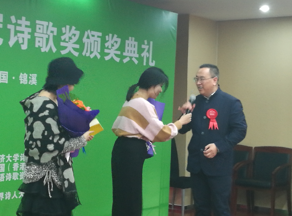 胡权权和石生给郁郁(阿角代领)颁发“中国桂冠诗歌卫士奖”