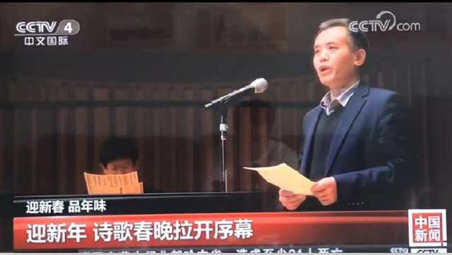 中国诗歌春晚总策划、屈原后裔屈金星在东京王子音乐厅2019第五届中国诗歌春晚日本会场致辞。中央电视台报道截屏图片
